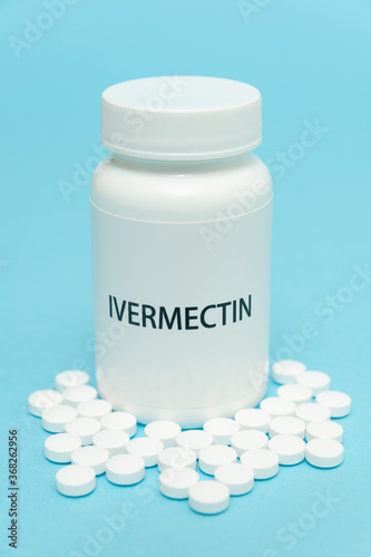 Treatments for Coronavirus (COVID-19): IVERMECTIN in white bottle packaging with scattered pills. Isolated on blue background. Vertical shot.