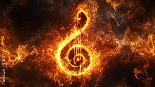 Treble clef engulfed in flames, abstract fiery music concept.