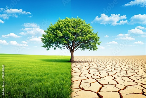 Tree amid green grass and dry cracked soil under blue sky with clouds. Left shows lush nature; right depicts drought. Concept of climate change. Ai generative