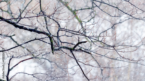 Tree branch with raindrops in winter forest during thaw