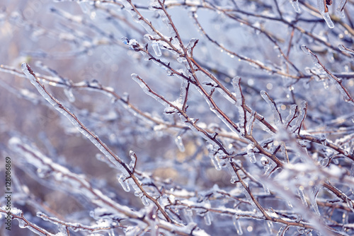 Tree branches frozen in the ice. Frozen tree branch in winter forest.