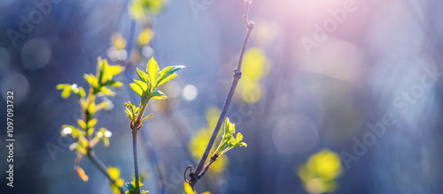 tree branches with shoots and the first young leaves in the forest on a blurred background in sunny weather