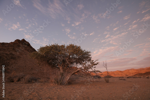 Tree going near large arid mountains in the Richtersveld area with some clouds in the sky