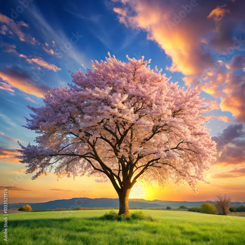 tree in sunset. tree, sky, landscape, nature, field, grass, green, spring, meadow, blue, autumn, sunset, clouds, trees, sun, rural, horizon, summer, countryside, season, environment, day, yellow, lone