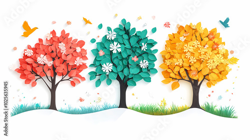 Tree isolated on white background, spring with flowers, summer with green leaves, autumn with yellow leaves, and winter with snow. Concept of nature and environment in paper cut cartoon style