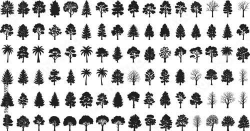 Tree silhouettes, botanical shapes, forest elements, natural diversity, conifer outlines, deciduous trees, palm silhouettes, bare branches, isolated trees, design resources, lan