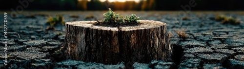 Tree stump illustrating climate change effects on deforestation concept. A tree stump surrounded by cracked earth, showing resilience.