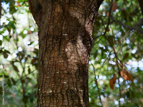 Tree trunk in the forest close-up, foliage out of focus, frontal view, bark texture, nature of France, Europe