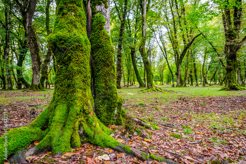 Tree trunks in green mossy forest