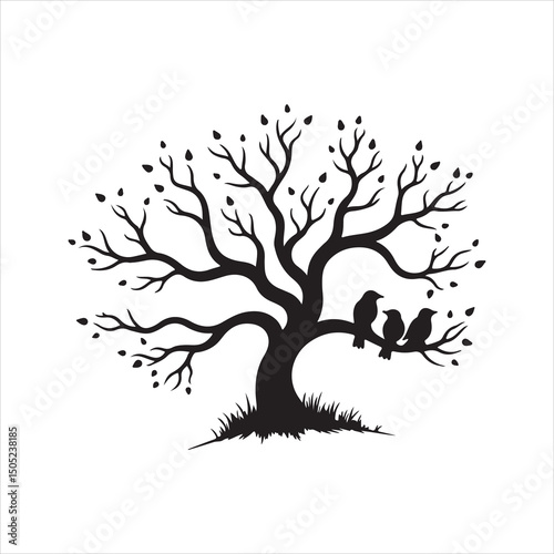Tree with Birds Silhouette, Birds Sitting on Tree Branch, Tree Branch with Birds Vector, Black Tree with Birds Clipart, Nature Silhouette with Birds,