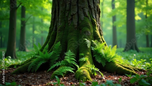 Tree with sprawling ferns covering its base and trunk, forest floor, nature