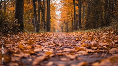 Trees and leaves are covering a path in an autumnal scene
