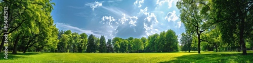 Trees And Sky. Summer Park View with Green Meadow and Panoramic Landscape