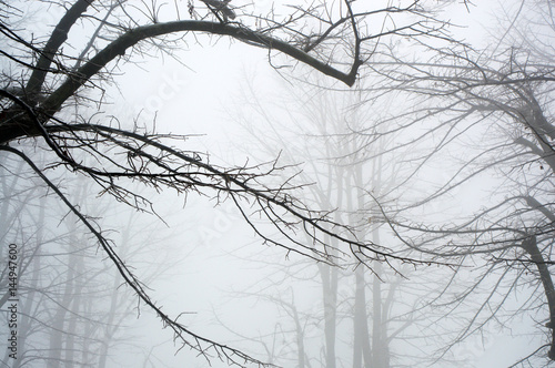 Trees and snow, mist landscape with silhouette branches, winter landscape