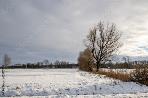 Trees in a snow covered field. Winter landscape in northern Poland