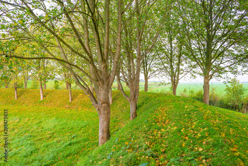 Trees in fall colors in a green grassy field in sunlight in autumn