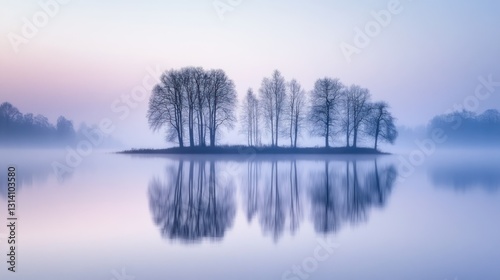 Trees on a misty island reflect in tranquil lake water