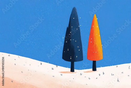 Trees stand on a snowy landscape under a blue sky with falling snowflakes near winter
