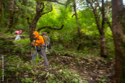 Trekkers hiking along a trail through the lush green forests of the Annapurna Himalaya, Nepal.
