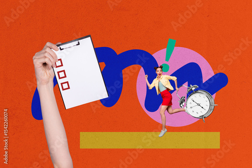 Trend composite sketch template 3D photo collage of hiring vacancy hr workspace hand hold clipboard document young lady run clock deadline