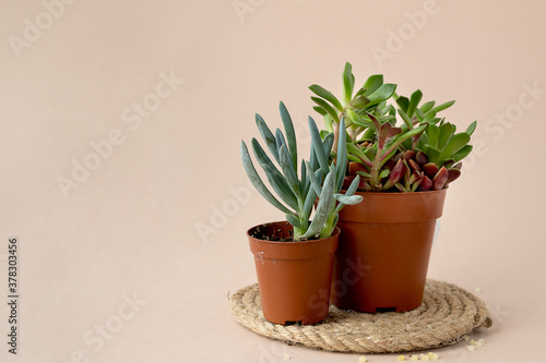 Trending minimalist banner with copy space for text. Green fresh succulents flowers on pale pink beige background.