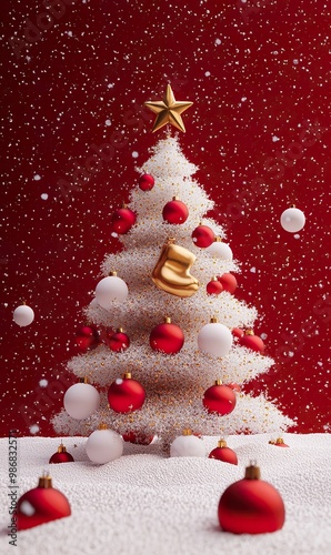 Trendy and modern 3D Christmas with a red, white, and gold centerpiece Christmas tree, snow, caroling, and a simple background
