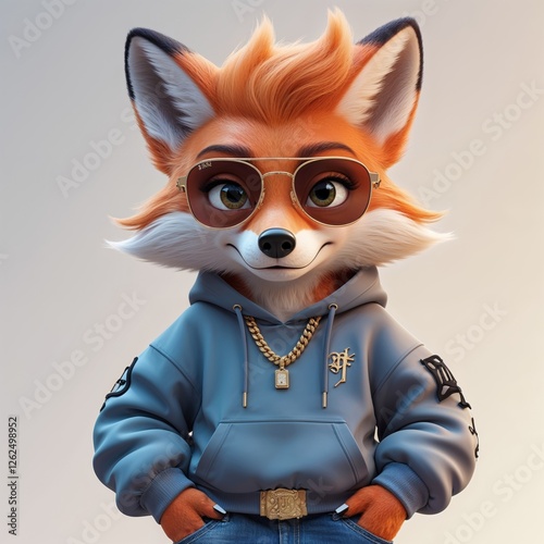 TRENDY ANTHROPOMORPHIC FOX IN STREET FASHION – AI-GENERATED DIGITAL ART WITH A MINIMALIST BACKDROP