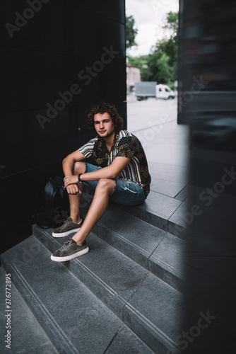 Trendy dressed male caucasian model posing on urban setting background sitting on street, young 20s hipster guy dressed in stylish apparel recreating in downtown on free time looking at camera