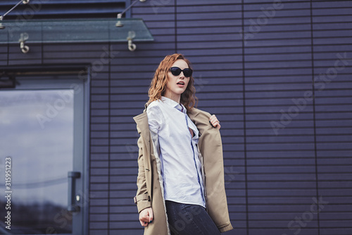 trendy fashion woman in casual clothes posing outdoors