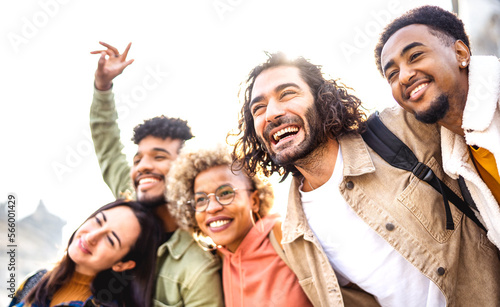Trendy friends cheering together at out side location on life style concept - Happy guys and girls having fun walking around Barcelona streets - University students on travel vacation - Bright filter