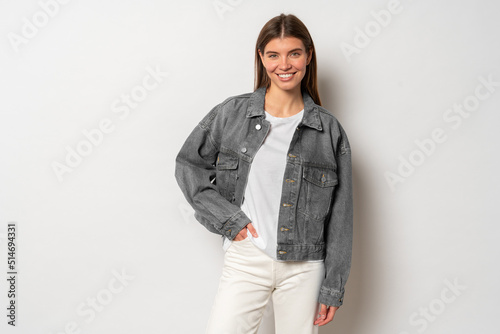 Trendy girl in casual outfit, gray jean jacket and white pants posing against blank studio wall