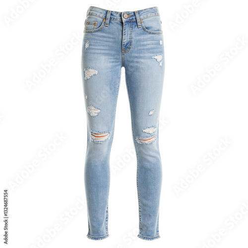 Trendy light wash skinny jeans with stylish distressed details including frayed knee holes perfect for a casual yet fashionable look