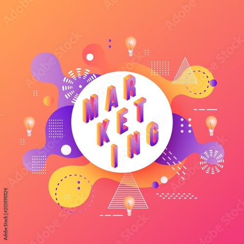 Trendy marketing poster, banner background template with orange red color abstract geometric shapes- circles and triangles and light bulbs icon. Vector modern advertising illustration