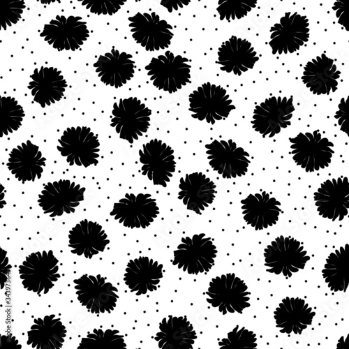 Trendy monochrome vector texture. Silhouettes blossom floral seamless pattern. Blooming botanical motifs scattered random. Ditsy print. Hand drawn wild meadow daisy on white polka dots background