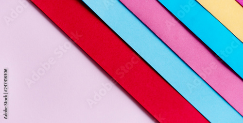 Trendy pastel colors in geometry shape flat lay. Colorful rainbow paper creative linear background.