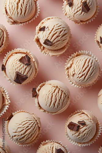 Trendy pattern of ice cream scoops with choco chips on pink background. Top view banner with vanilla gelato pattern. Summer cooling dessert. Icecream balls retro flat lay. Design for poster, print.