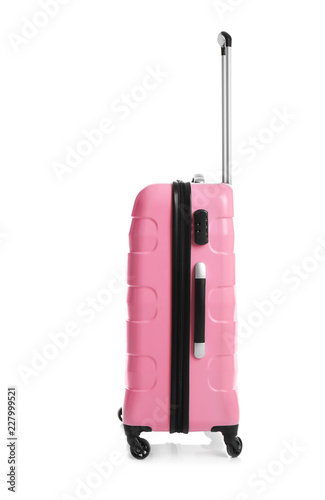 Trendy pink suitcase on white background