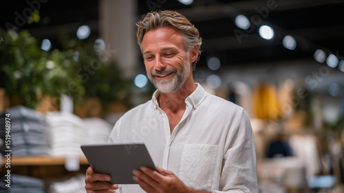 Trendy retail environment with bearded man holding tablet in one hand and scanning QR code on product tag with the other, showcasing tech-driven inventory