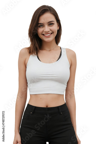 Trendy woman wearing a cropped tank top shirt, posing on a transparent background. isolated, transparent background, no background. PNG.