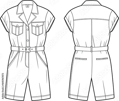 Trendy women’s belted romper, utility style playsuit, fashion technical sketch, short sleeve jumpsuit design for summer collection template