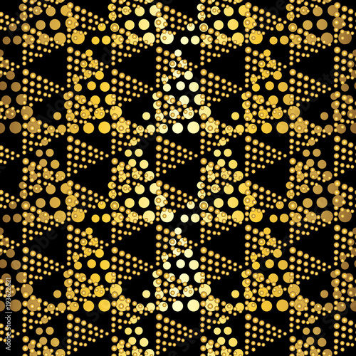Triangle points.Golden sequins. Splashes of shining particles. A tool with gold drops. A rich background. A vector illustration.