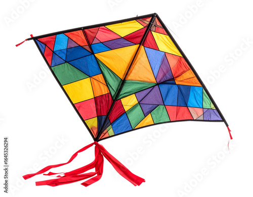 Triangular Kite with Patterned Fabric and Flowing Red Ribbon, Angled Perspective, Isolated PNG