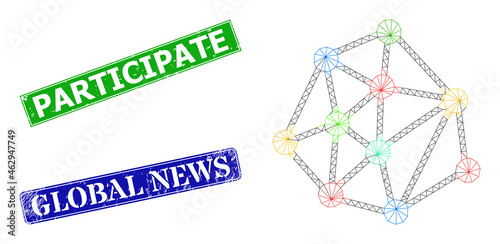 Triangular mesh links image, and Participate blue and green rectangular unclean stamp seals. Mesh carcass image is based on mesh links icon. Seals have Participate title inside rectangular form.