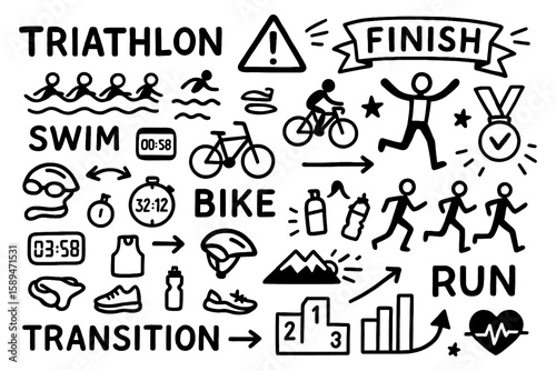 Triathlon Sport Doodle Icons Set, Swim Bike Run Race Hand Drawn Illustration, Athletic Competition Elements, Marathon Cycling Running Graphic Collection, Black White Transparent Background