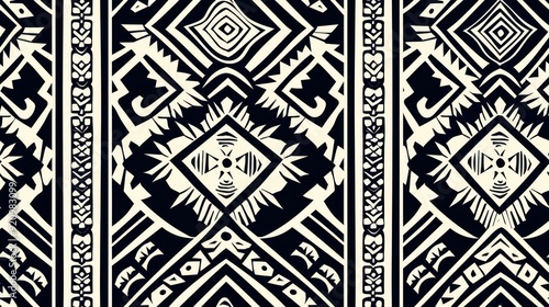 Tribal black and white geometric pattern with intricate details, creating a bold and ethnic visual. Seamless pattern.