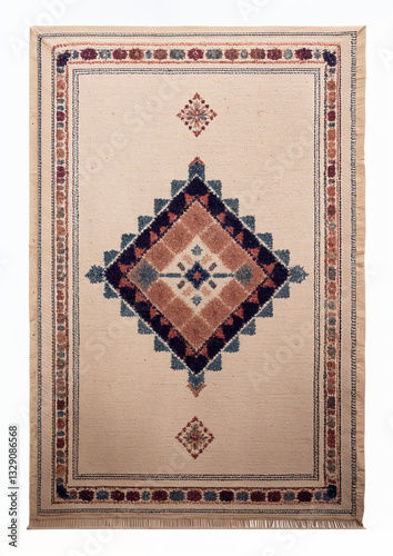 Tribal carpet in beige and blue, adorned with a diamond pattern that highlights its unique artistic design