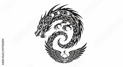Tribal Dragon Tattoo Design with Skull and Wings, Black and White.