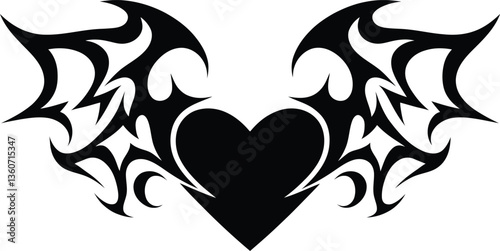 Tribal Heart with Wings - Black Tattoo Design Vector