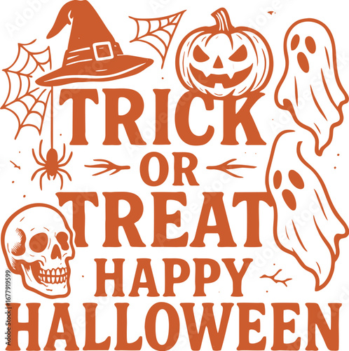 Trick or Treat Happy Halloween Vector with Pumpkin, Skull, Ghost, and Spider Web