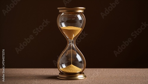 Trickling golden sand through gold-framed glass hourglass on textured tabletop, dark brown backdrop